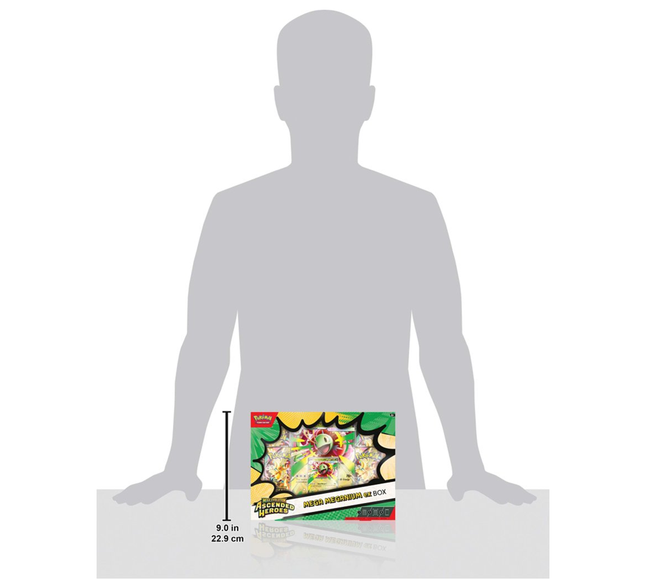 Forge a bond that takes your partner Pokémon’s strength past the limit with Mega Evolution! In this box, you’ll find Mega Meganium ex, Mega Emboar ex,or Mega Feraligatr ex as a playable foil promo card, along with an oversize lenticular card with dynamic artwork and four booster packs from the special Mega Evolution—Ascended Heroes expansion.